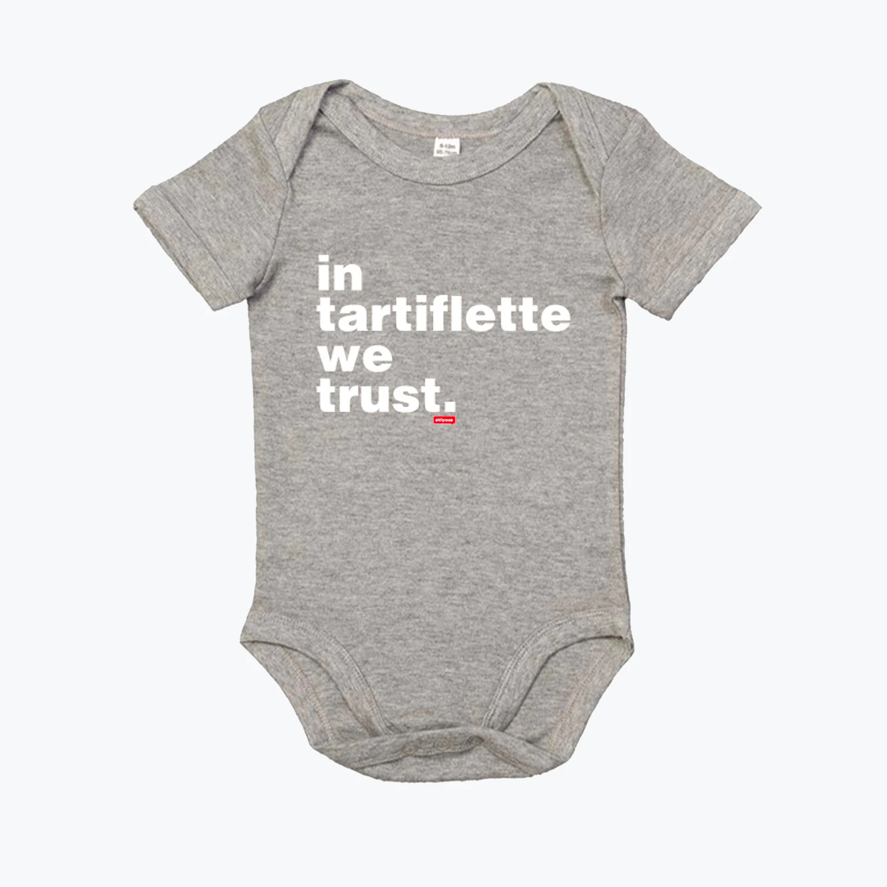 Parce que les valeurs essentielles s'inculquent dès le plus jeune âge et pour faire comme papa (ou maman), découvrez le body bébé In Tartiflette We Trust. Disponible en bleu chiné, rose et gris chiné.